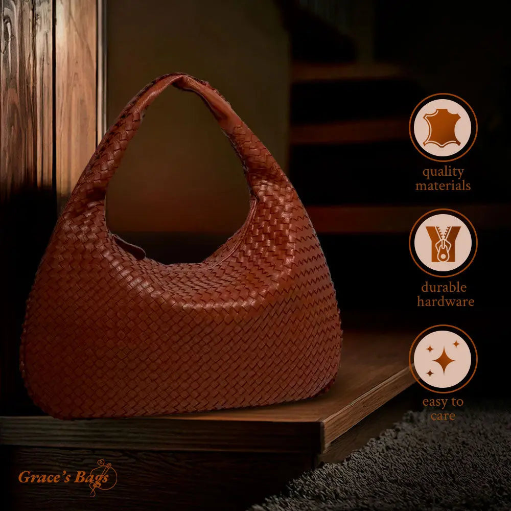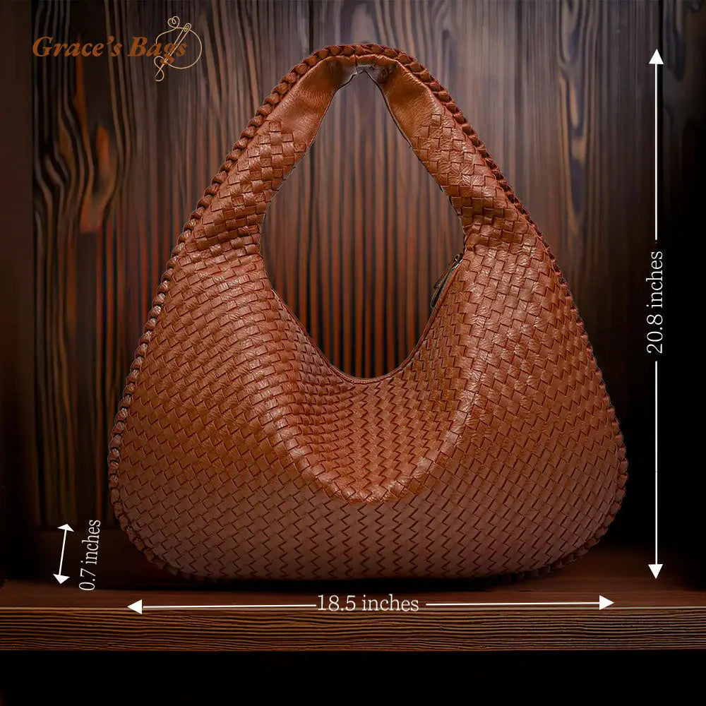グレースからのメッセージ:このバッグは、時代を超えたデザインと細部へのこだわりの祝福です。編み込まれたレザーのテクスチャーが贅沢な感触を与え、現代的なホーボーの形が多用途で機能的です。この作品があなたのワードローブにとって大切な追加となり、使用するたびに美しさと実用性を提供することを願っています。